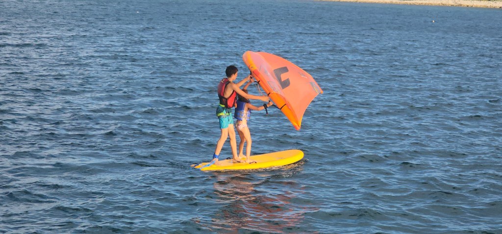 We went back to the boat for lunch. We cleaned up and organized the back part of the boat and then wing foiled again. We are all improving but it’s defiantly hard, especially now that we can only go downwind.