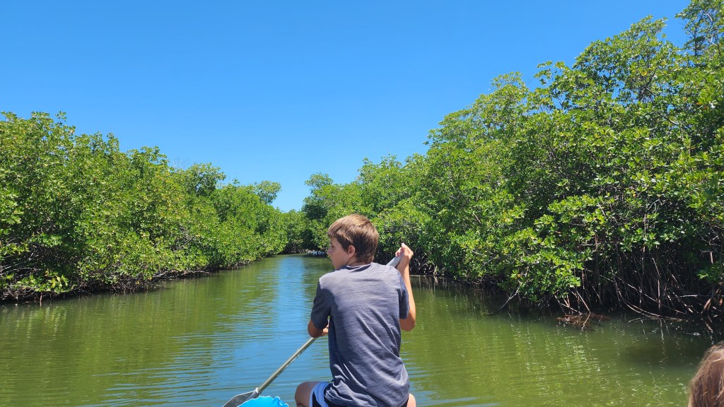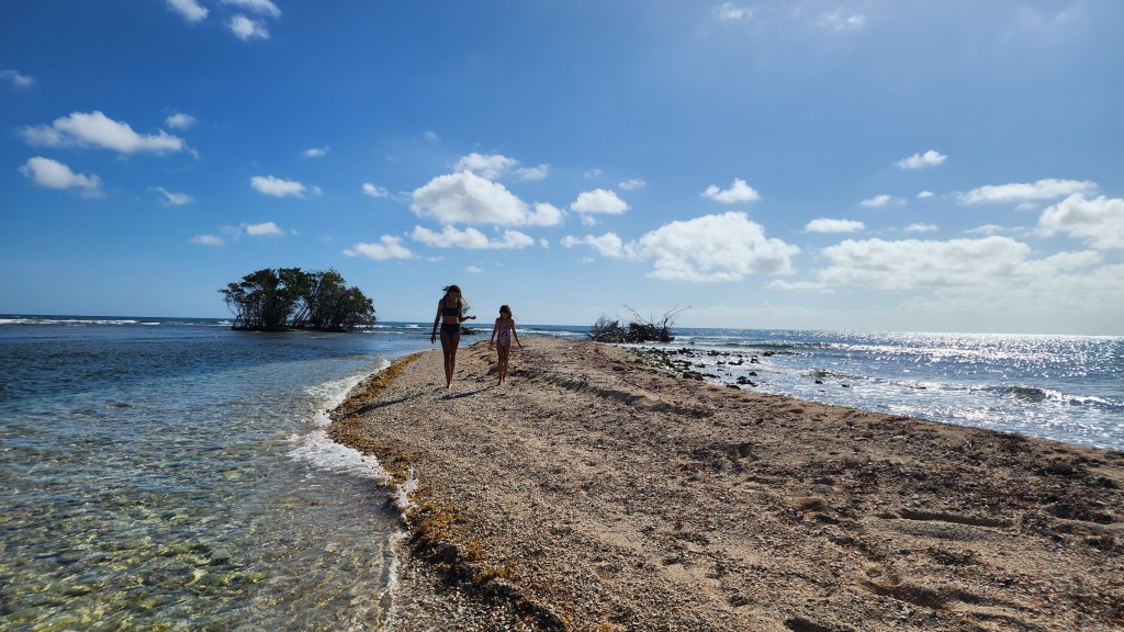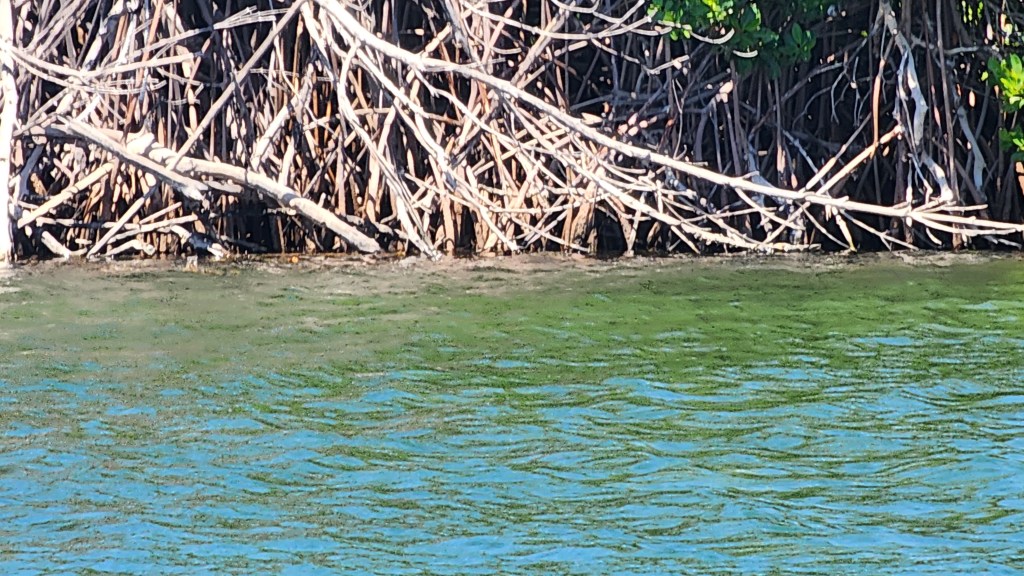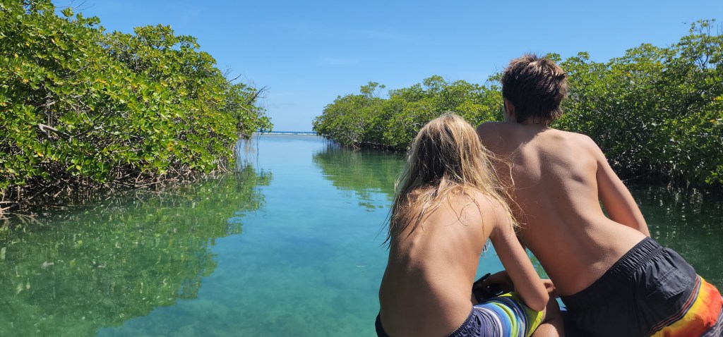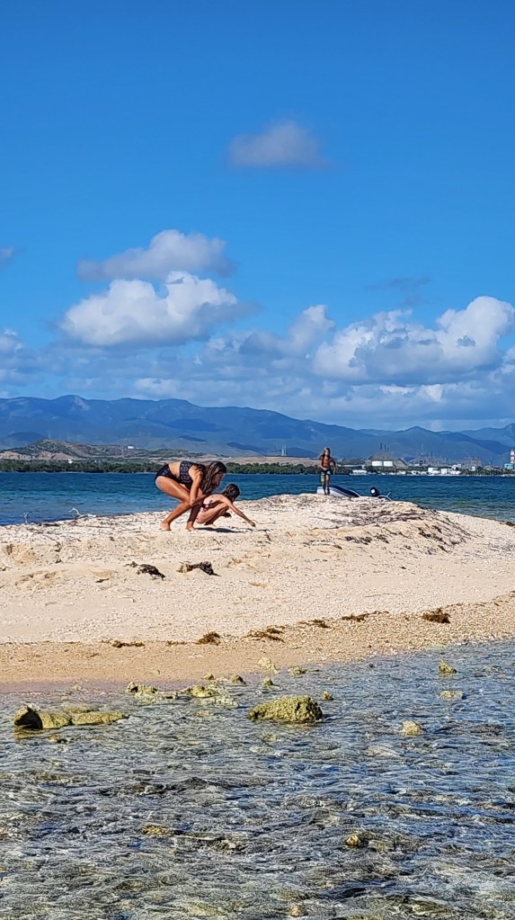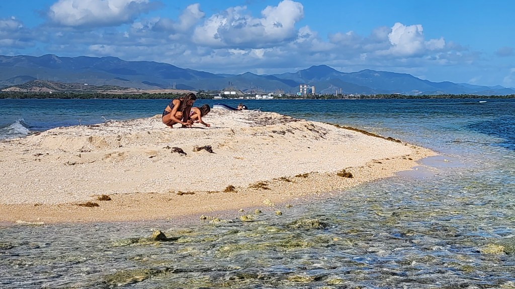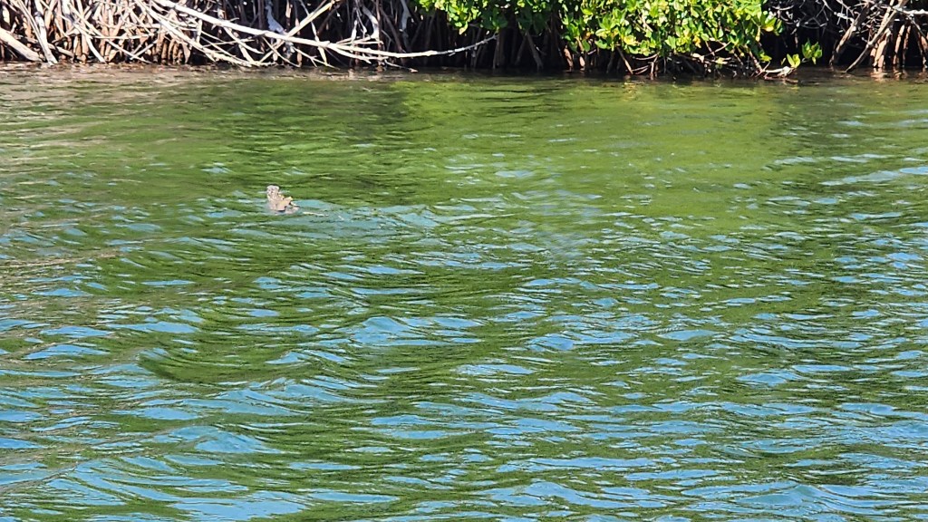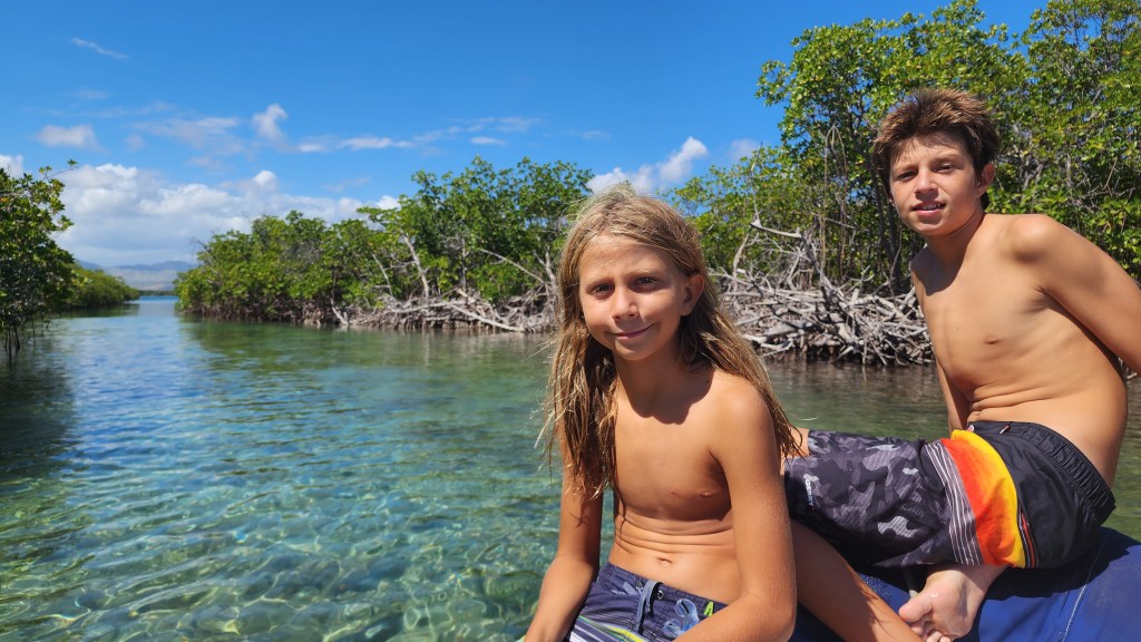 What a difference 24 hours makes. We were planning to return the car and go to Isle Caja de Muertus, then a day at Boqueron and onto DR to meet Holly. Sadly, they had a passport issue and weren’t able to make it to DR. The good news is they are re-routing and coming to Puerto Rico. We spent the morning doing school. Kira saw a manatee off the side of the boat and we watched it surface a few times. Cale went to return the car. He had a work call and I took the kids to explore a mangrove inlet. It was really cool. We ended up at a big area that had been cleared. There was a road with a bridge that had collapsed that apparently was used at some point. There were tons of crabs that had one big claw they carried around. They were pretty small but all over. Just as we got out of the bay we saw something that looked like a muskrat or otter in the water. We finally realized it was an iguana swimming across the bay.