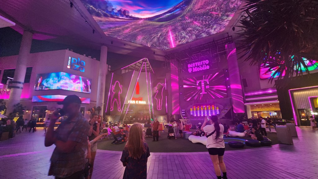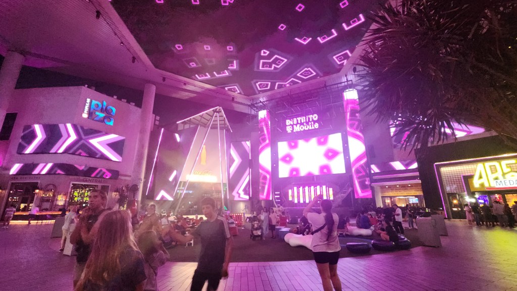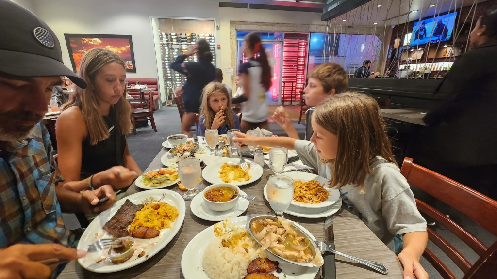 As we left we saw big iguanas. They were just hanging out on the fort. At this point it was almost 5 and we were all so hungry. We looked for food as we walked back to the car but didn’t find anything. We decided to drive and see what we found. We ended up in a very cool, modern shopping area. We found a Metropol. Cale and I had it when we came last year to look at the boat. We have been talking about the rice and beans from there ever since. It’s was super yummy. It was in a Marriott hotel near a very fancy new convention center. We walked after to the outdoor mall area. It was unlike anything I’ve ever seen. So many giant screens, loud music, seating and yard games.