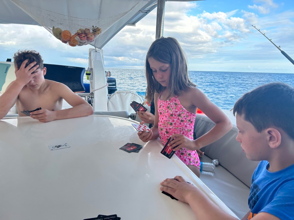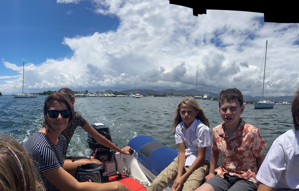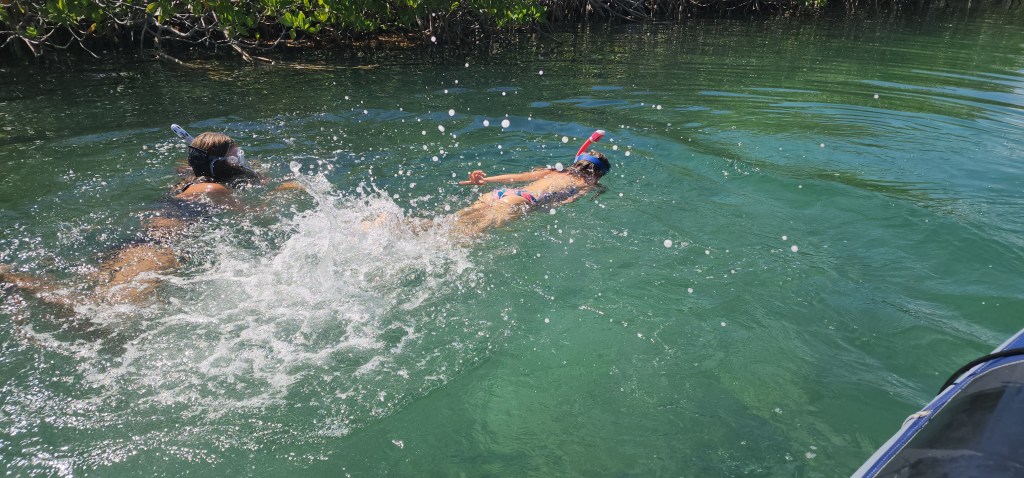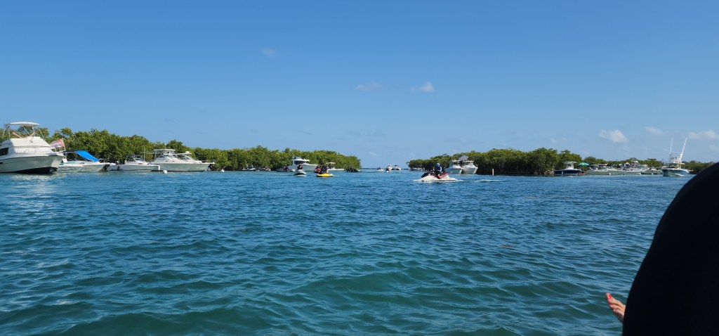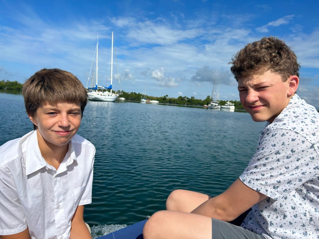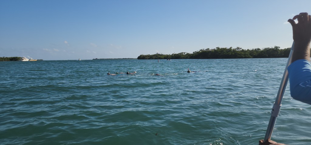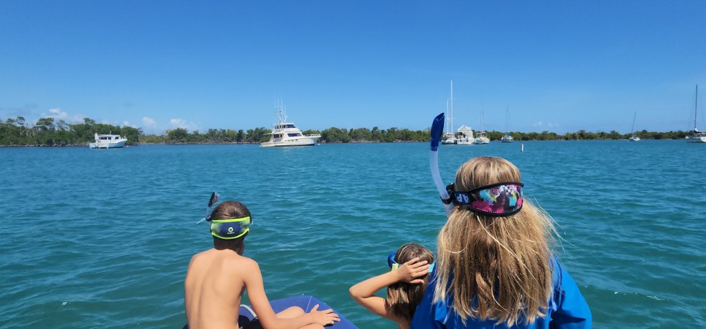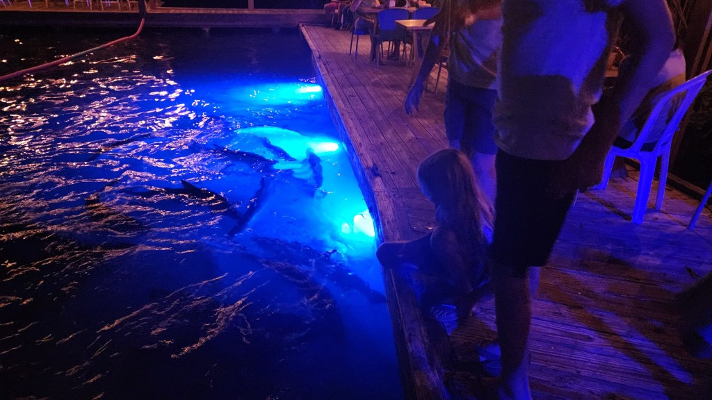 We got the boat clean and were excited to get the Carlson on board around 2. We got changed and took them exploring. We pulled the paddleboard behind us and it gave us more space. We went across the bay to the water inlet. We tried to pull the dinghy up but it was rocky and hurting our feet. The older boys played in the waves and then we all slowly snorkeled and swam back up the inlet. We dinghied over to the next bay and a bunch of locals were there with boats, jet skis, floats and lots of loud music. We pulled in to check it out. Then, we went back and found some manatees. The visibility still wasn’t great but we all got pretty close and it was so fun to see them. We came back and went to dinner on shore. There was live music. It was really good but super loud. The restaurant workers feed all the scraps to the tarpon so the kids had a blast feeding them and even trying to catch them. Cale and I were going to run to Walmart while everyone else went back and got settled but things changed once we got to the car. We opened up the front doors and within 10 seconds there were 6 or 7 cockroaches. They were all over. It was so gross. We decided to wait and we won’t take anything with us to church tomorrow. Hopefully, no cockroaches on the boat.