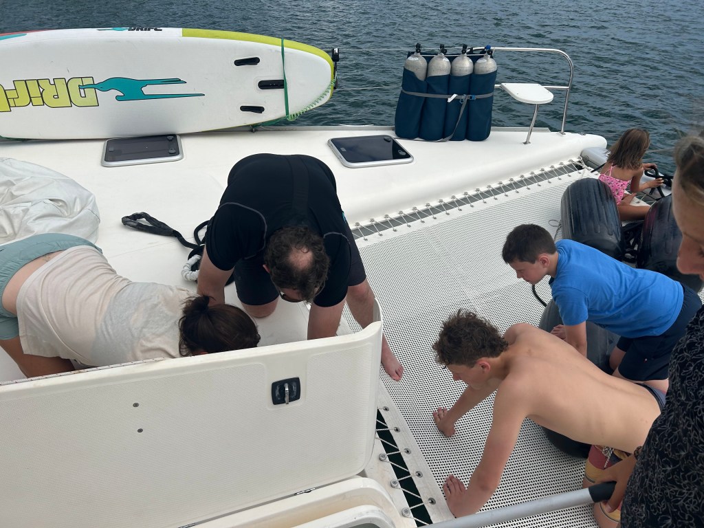 Once Cale got off his call we picked him up and all set out to explore. Pretty quickly we saw some manatee and jumped in. Sadly, it was so mirky it was hard to see but still pretty awesome how big they were. It was fun. We kept exploring to check out a surf reef, which took us then to the coolest little beach island. We explored that for a bit. The boys looked at the surf. The girls found some of the coolest shells. We saw more manatees on our way back. We also had a huge ray jump pretty close in front of the boat. We came back and worked on some boat organizing and finding a place to store the wing foil gear.