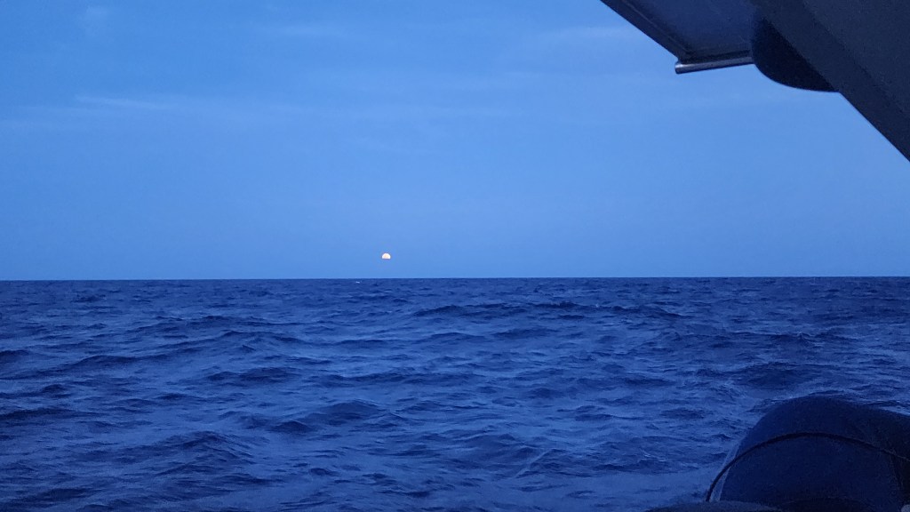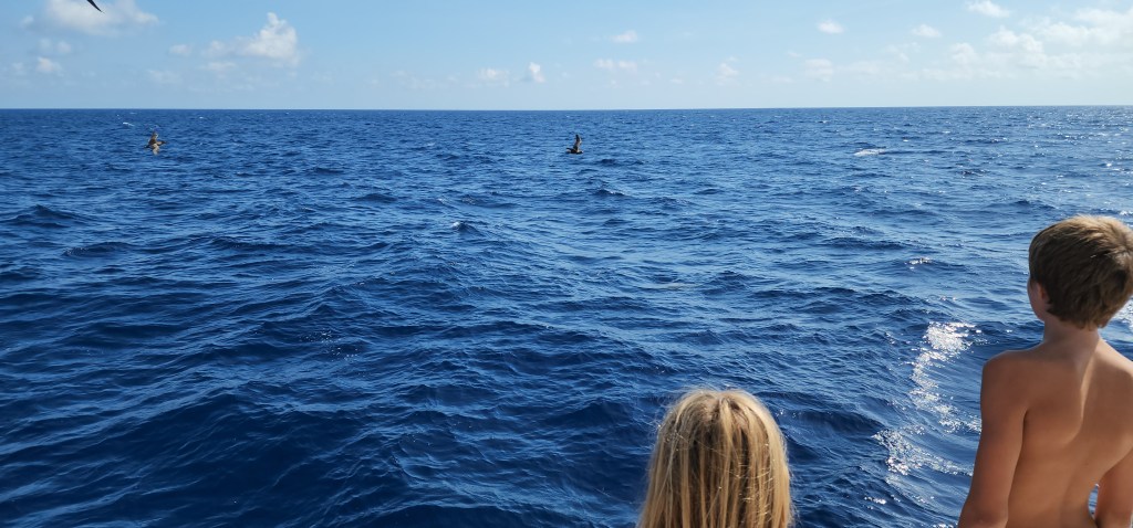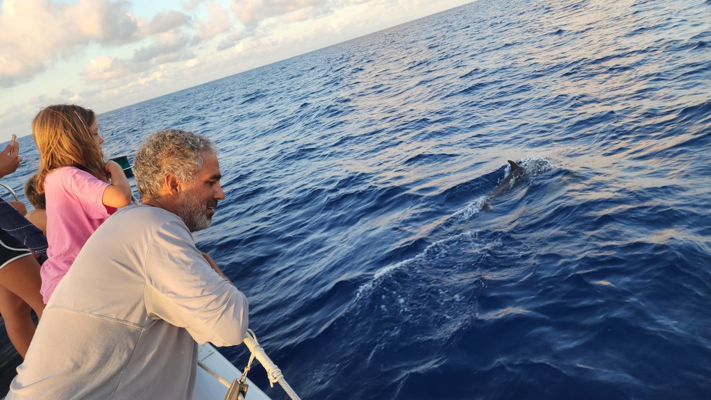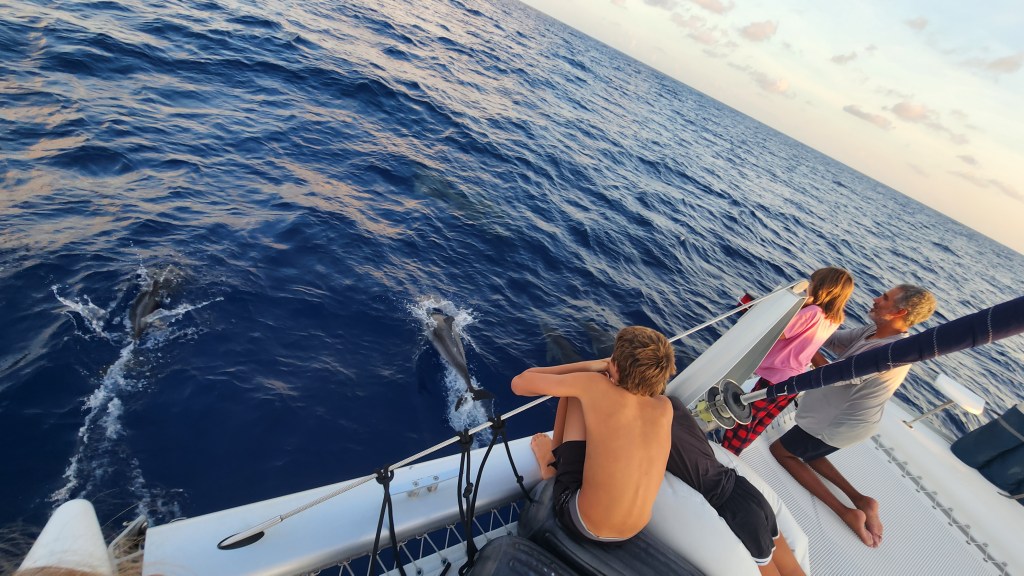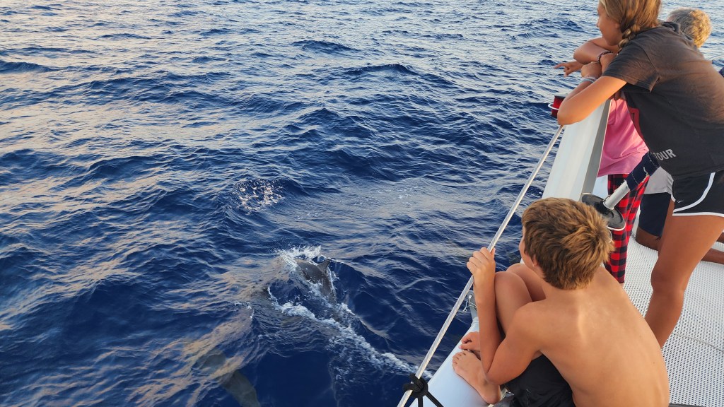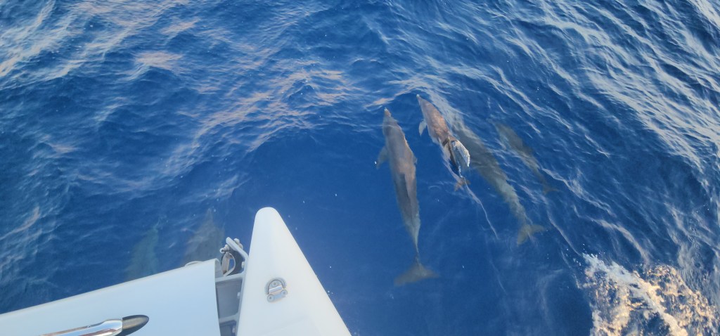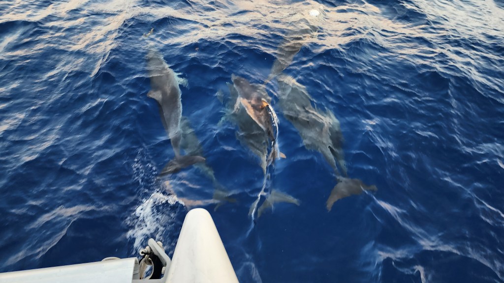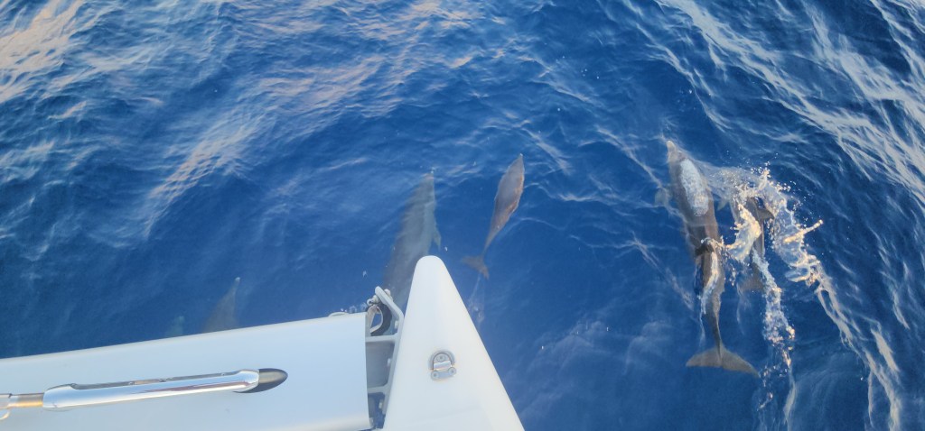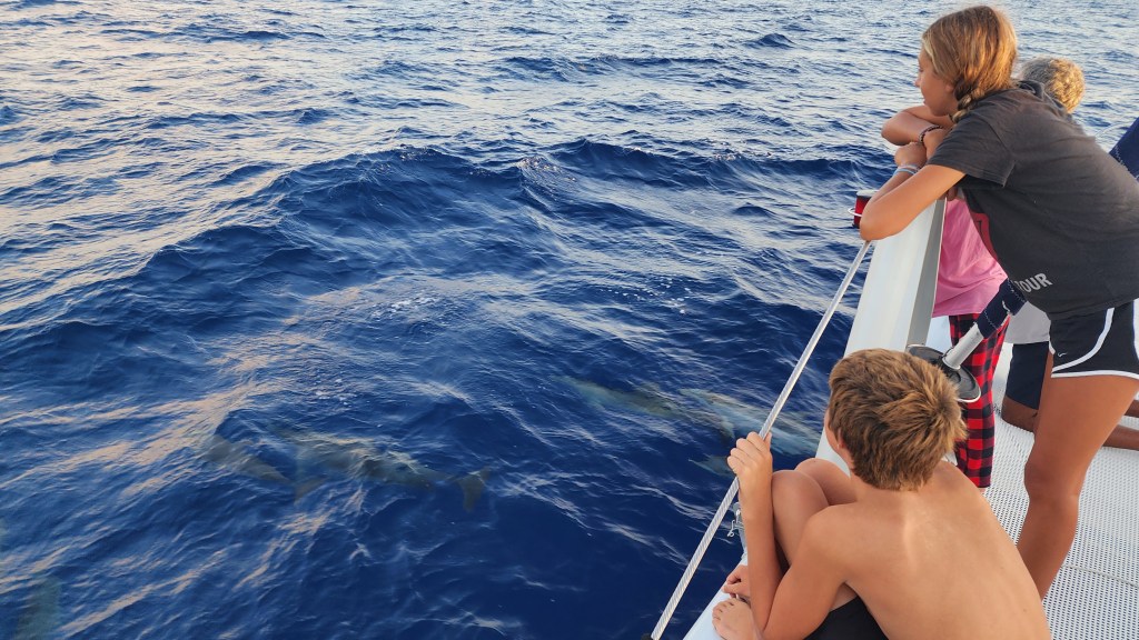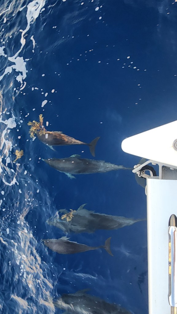 5-3 Our day started super early, at 1:30am. We got ready and started to pull up anchor for our first Mona passage crossing west bound. It was of course dark, and nothing can be easy. The bridle and all the chain was covered in mud, so I was going slow to rinse as it came up. Thankfully, Cole woke up and came out to help. I was grateful for his help because when we got to about 30 feet something weird was happening with the chain. It was going different directions and really straining the chain and windlass. We finally realized it was a big line wrapped around the chain and anchor. We were able to get the anchor out of the water and once Cole started to push some of the muck off the anchor the line slipped off. It took longer then normal, putting us on our way at 2:15. I sat up front and watched for lines for a bit and then let Cale take over and tried to get some sleep. I didn’t sleep great, but got some rest. About 5:30 or 6 I went up and relieved Cale. He was about to go back downstairs when we started to see dolphins. There were sooo many. He rushed down and woke up the kids. They stayed with us for about an hour. At first there were a lot of smaller ones, then it seemed like they got tired but lots of them stayed with us. It was awesome!