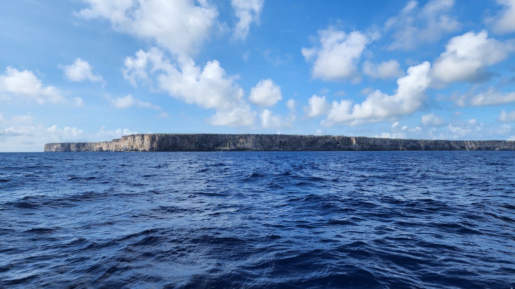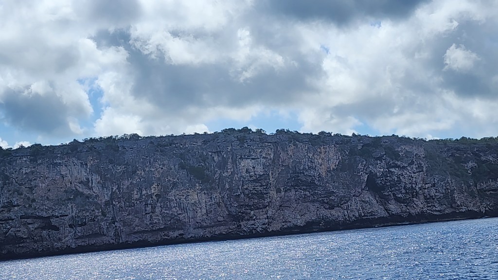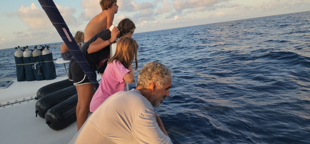 We decided to pull into Mona Island briefly. On the way in the water was so clear. It was 50 feet deep and you could see to the bottom. It was a beautiful blue color. It was absolutely amazing. There were tons of birds flying all around and we even saw a turtle go by the boat, it was just floating along. There is one mooring ball, which was open. We were all super hot so jumped in. Cale, Cole and Kelsey were in the water first. It was about 1 minute and they started yelling shark, shark! Soon, Cale was saying it was coming up and to swim back to the boat. I’ve never seen Kelsey swim so fast, Cade too. I will never forget Kelsey’s little arms swimming at top speed. Cole just leisurely was swimming along away from the boat until we forced him to come closer. The kids all got back on the boat, but slowly we all got in to see the shark. It was about 50 feet deep and it looked about 3 or 4 feet long, so our guess is they were pretty big. Soon, there were 2 and then 3 and 4, and then a huge ray and a grouper. Once the sharks started to be more interested in us we were out. It was a pretty surreal experience.