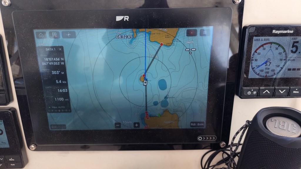 We decided to go fill our propane tanks and check out some shopping. We ended up at a huge store. Sadly, we don’t really have much more room for food. We then were shocked to see an Ikea. We had to look around just because then we had lunch there before grabbing a few groceries at the store right next to Ikea. We stopped at Prop-ogas on our way home to fill tanks. It was so easy, literally just drive through like a gas station. We came back and I prepped food and we returned the car. The armada officer came at 4:30 and checked us out. It was calm leaving the dock. Immediately after getting out of the channel it got really rough. Huge waves, but they were pretty far apart so we weren’t slamming into them too bad. Cale had marked the coordinates of the safest passage so we followed that and if got better pretty quickly.