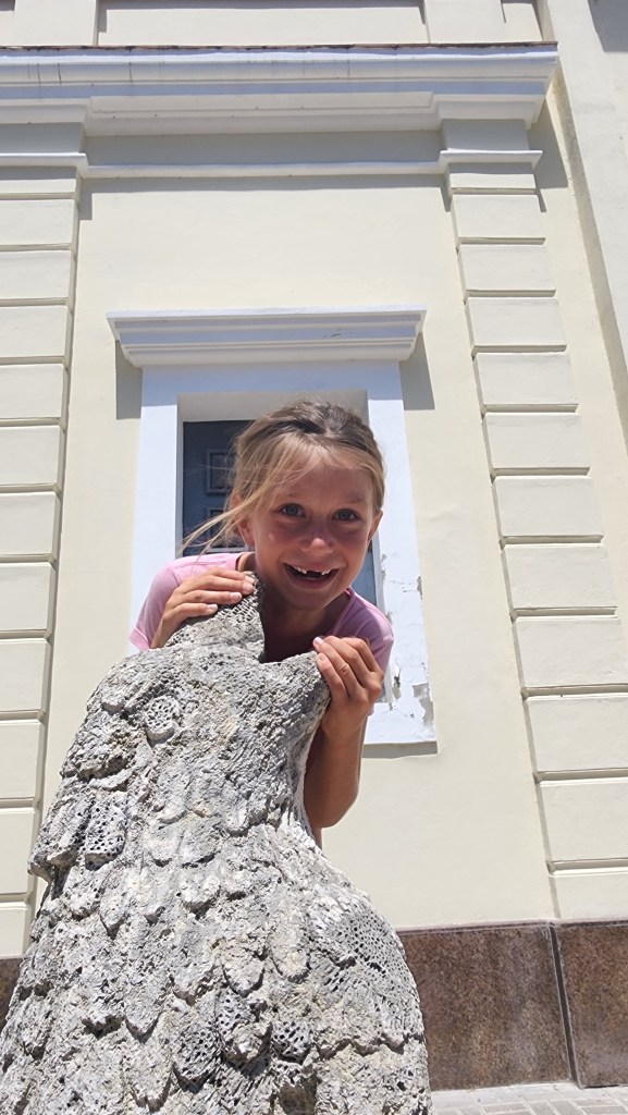 We opted to keep going because I thought the kids would do better if we did a Cho Cho tour (bus), since Kelsey was struggling. Another tour guide approached us and we ended up using him. He said just $40 for an hour and a half. It ended up being closer to 3 or 4 hours. We explored the whole area with him. We started at a little souvenir shop for the bathroom and he taught us about the stones in the country, the amber and
