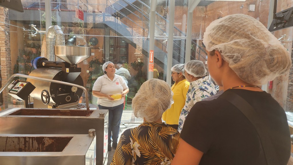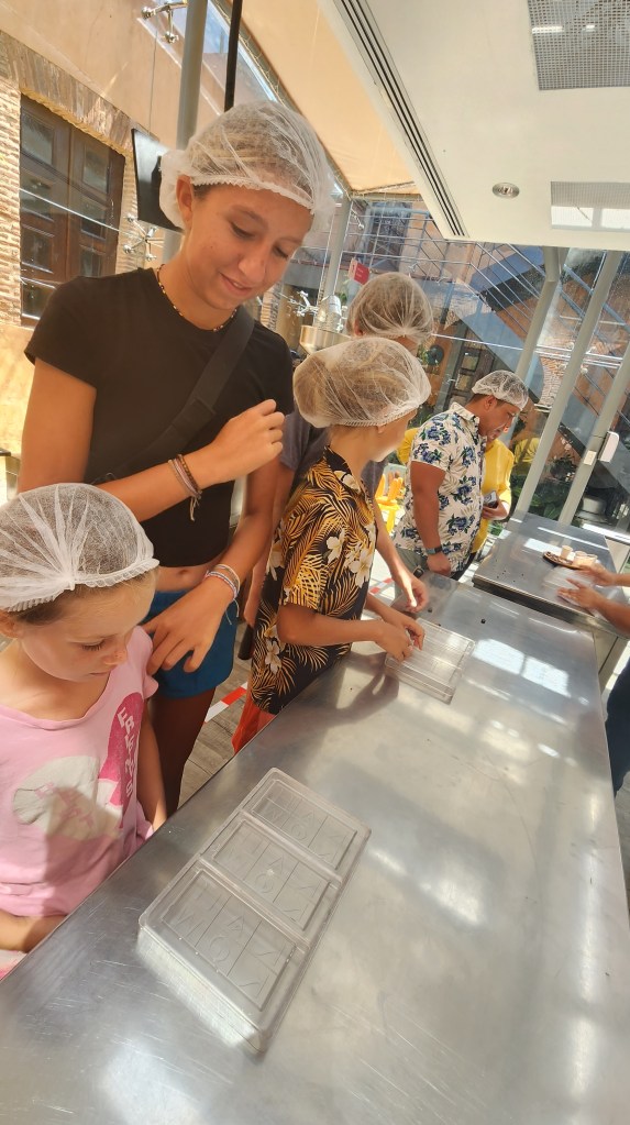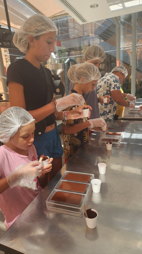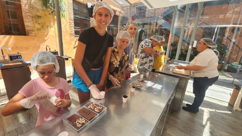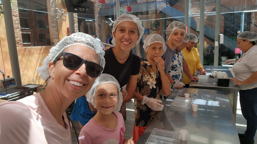 We did an audio tour of the catholic church. I liked the story of a huge picture of St Antigua. The picture was on a boat that was ship wrecked in the Virgin Islands and the picture was rescued and brought to this church. We also got to make chocolate bars and saw the whole process. 1. Dry beans. 2.Separate shell from bean. 3. Grind them up. And separate the butter/ fat out of the bean. 4. Combine the bean, shell ground up, and sugar to make chocolate liquid. 5. Mix for 38 hours. 6. Pour into bars. We all got to add in our toppings.