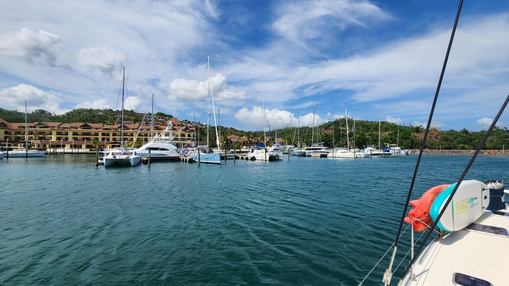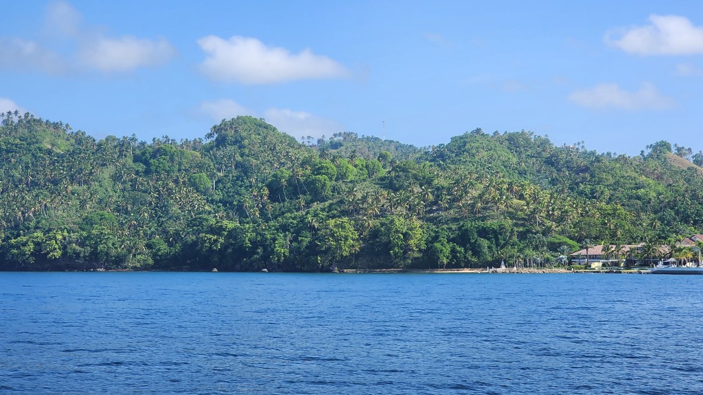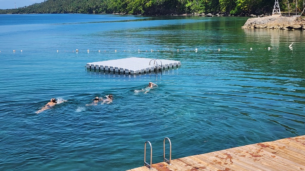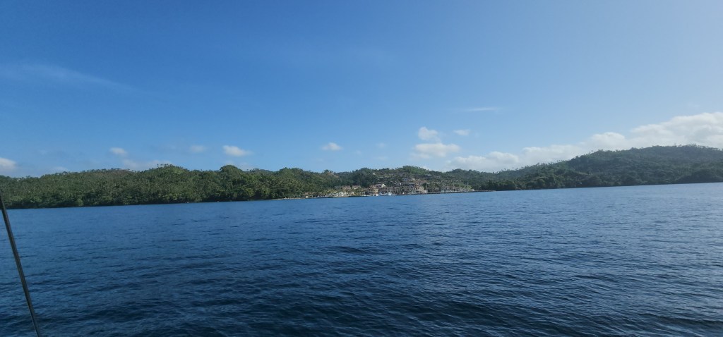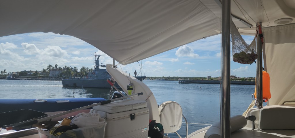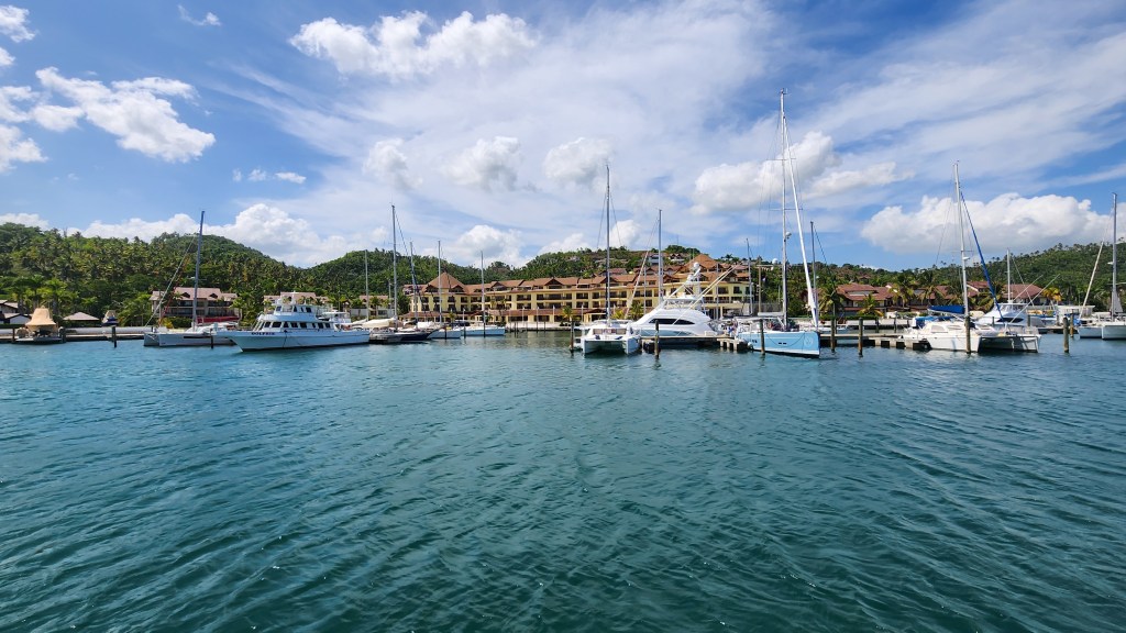 We had breakfast underway. The coast line of the Samana peninsula is so lush and tropical. It’s beautiful. The slip was very small, but Cale did great maneuvering and it went awesome. They were very helpful at Marina Puerta Bahia grabbing lines and securing fenders.
