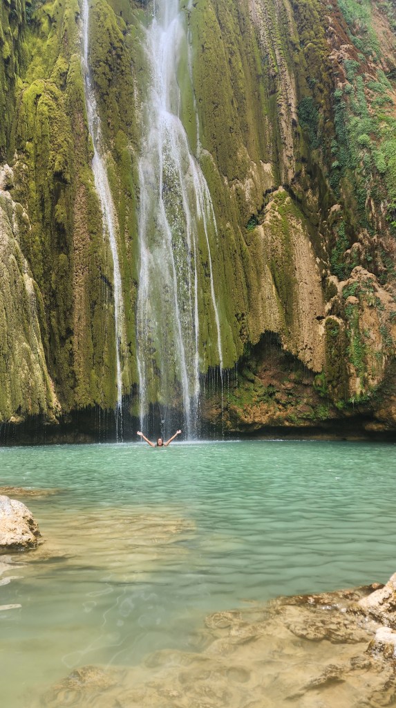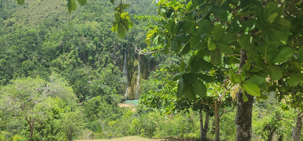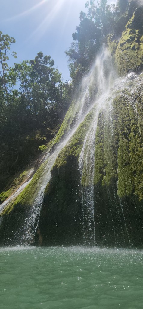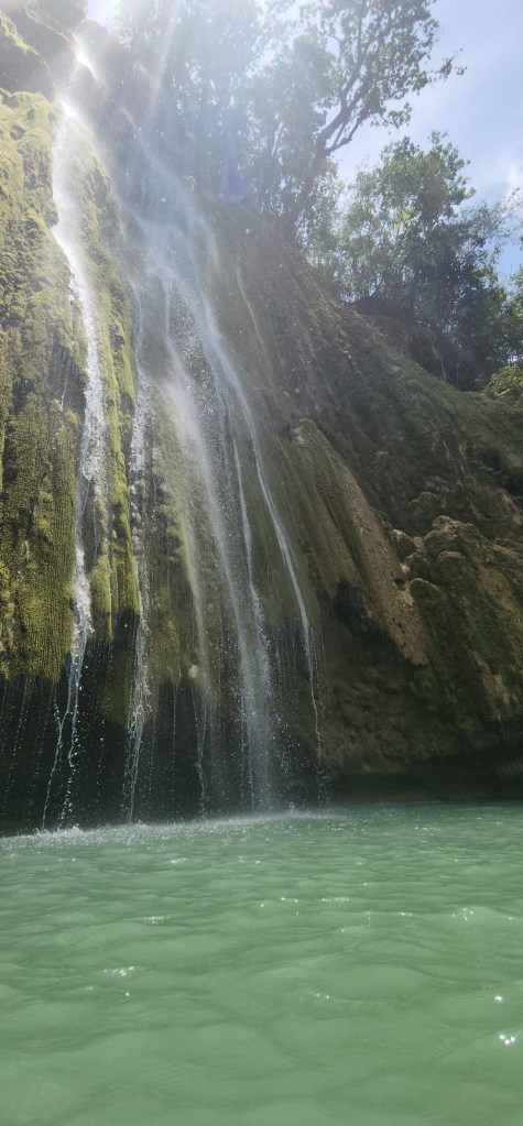 It’s crazy to me how many awesome days you get to have living in a boat. It makes me wonder, is this just because it’s so new or what. I got up early and went to the gym to workout. It felt great. We left around 9 for El Limon. It was about a 25 minute drive. As soon as we got within a couple miles we had several motorcycle locals approach us. One had us follow him but we turned off and then another one had us follow him. It was a bit weird because we hadn’t planned to have a guide. We ended up at El Cafe, which we heard was the best way to hike in because you get a better view of it from a distance. We set up a guide named Paulino. Entry was $90, which was totally too high, but oh well. We also asked them to prepare lunch after for about $8 per person. The hike wasn’t too bad. A little slippery in spots. It was mostly up hill until you get to the hut with drinks where you have the most amazing views. From there, it’s a pretty short hike down to the falls. We stopped briefly at the first one, una pequena cascada, and swam around. It had a cool grotto area behind it.
