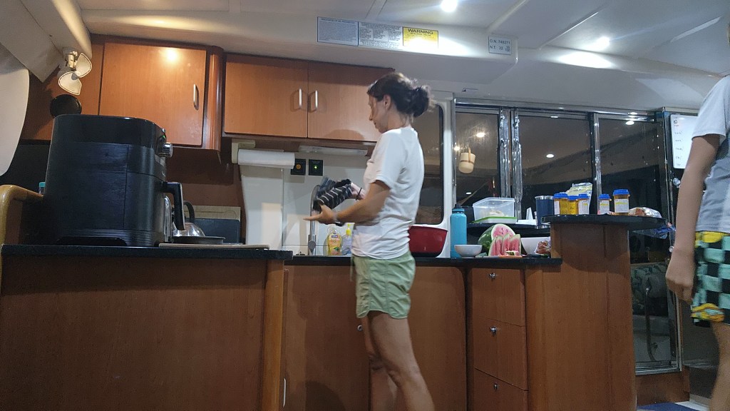 We got back to the boat and the kids played pool, Kira did homework. The kids and I worked out. We got more laundry loads done and had omelets for dinner. Cale wasn’t feeling great so he went to bed. We are hoping to leave tomorrow for Ocean World.