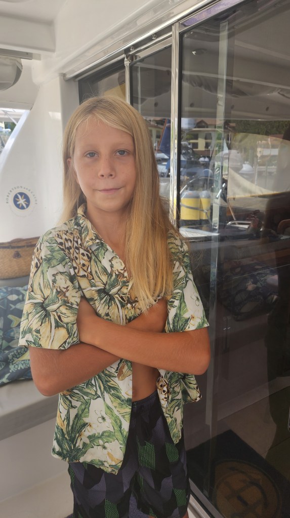 Once the kids woke up, they did school and then we tried to check off stuff on our to do list before we left. The kids wanted to workout so we did that first, then we went looking for a mango tree. We found lots, but not too many had ripe mangos so we picked some green ones and are hoping they’ll ripen. We then swam for about 30 min, had lunch, and then got ready to leave. Sadly, several boats came in with kids. One we didn’t even talk to because they were docking and we were leaving. They are all heading south to Grenada.