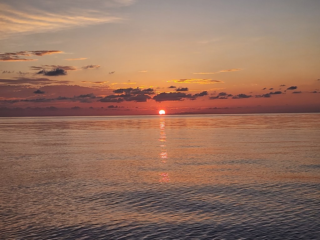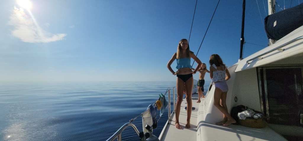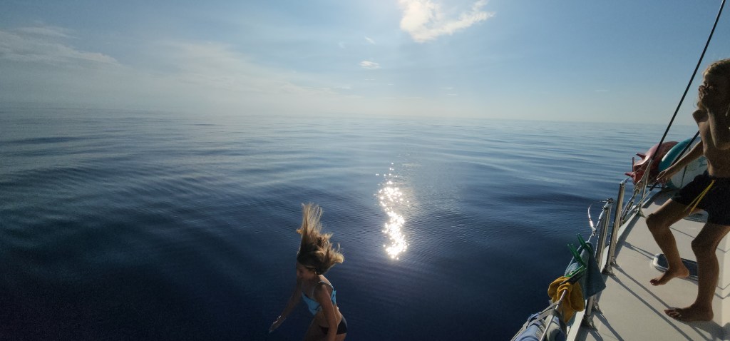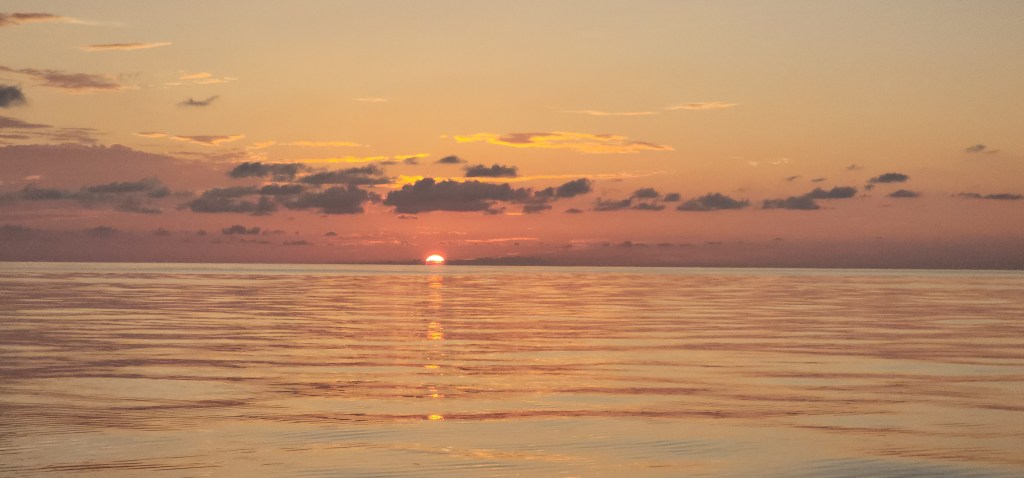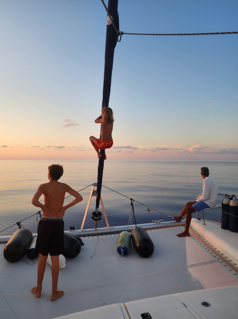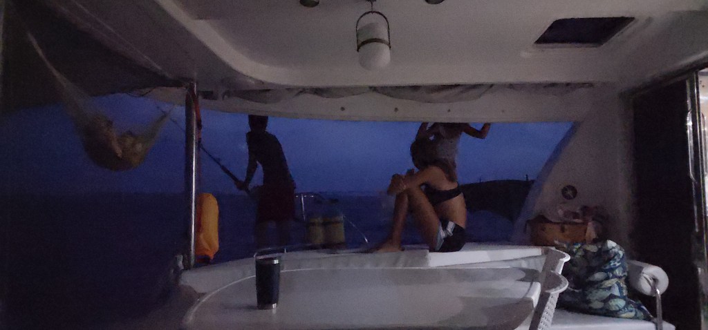 We headed out around 3pm. It was so calm the entire way. Just unbelievable. It felt like a lake. This allowed us to be a lot more productive on passage then normal. We did a marine biology lesson, played uno, and kept up on keeping the boat clean (when its rough the boat is usually a wreck once we stop). We stopped in the middle of the ocean and jumped in the water for a break and just because it was sooo clear. It’s crazy to think it’s 7500 feet deep and there is just nothing you can see. We were all a little nervous to jump in, but it felt very refreshing. We had dinner and then watched the sunset and did scriptures. It was a nice day. The water is absolutely so amazing and the whole day was so peaceful.
