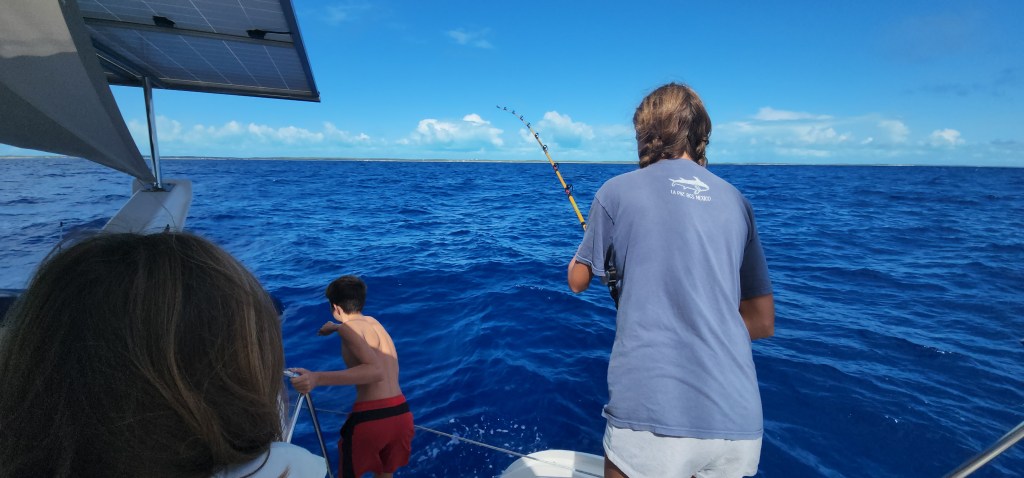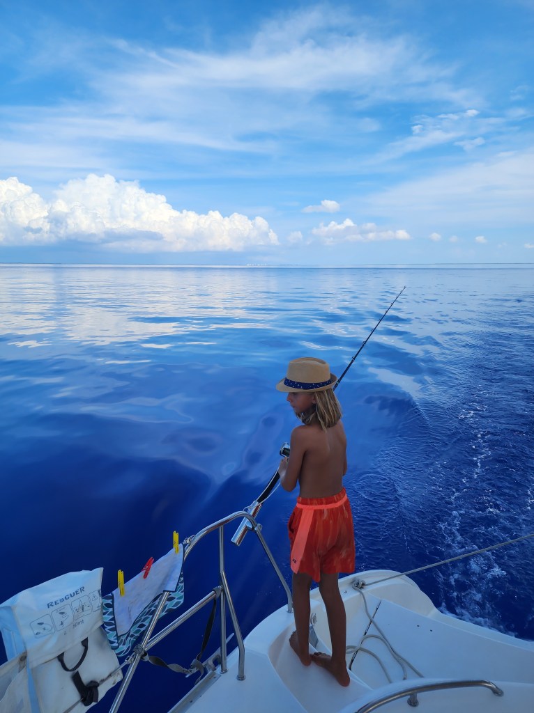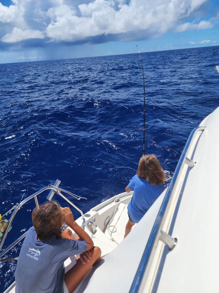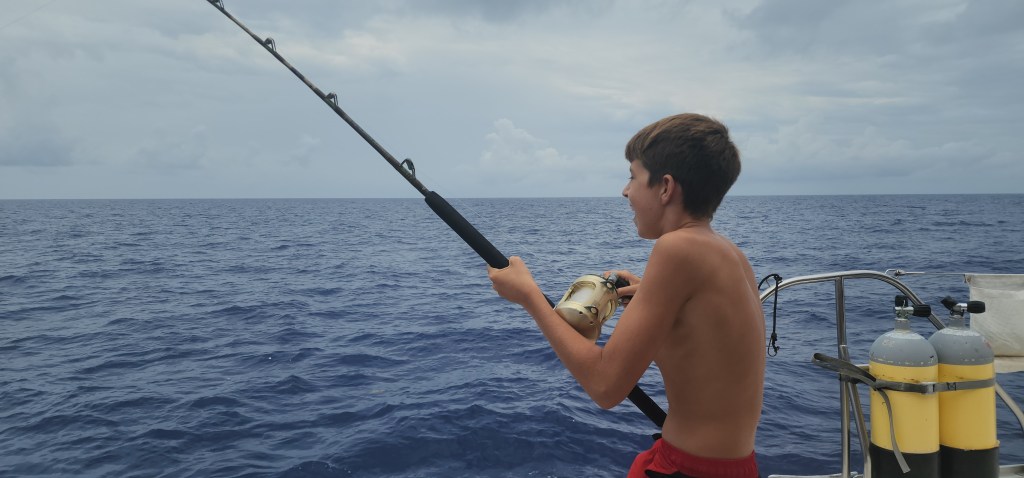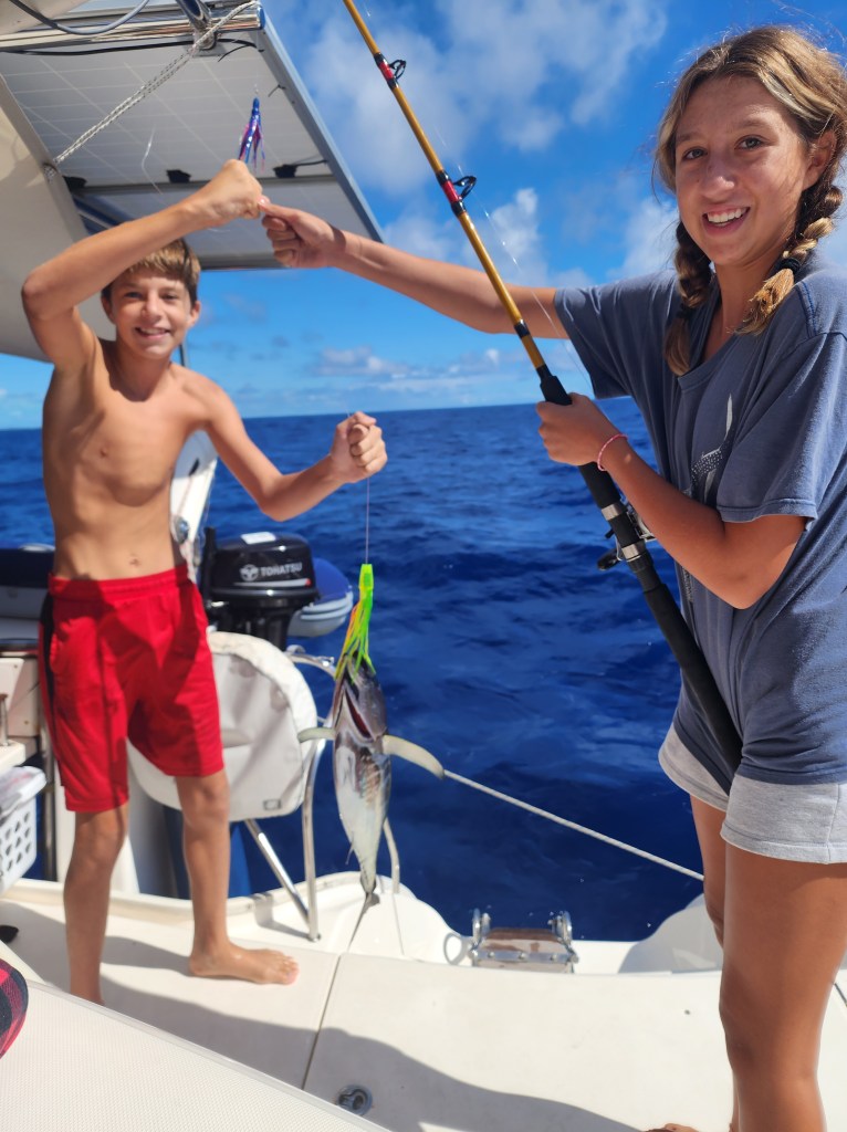 We caught another fish, a tuna. Kira reeled it in. Cade had a mahi mahi on the hook but it came off. We cooked up the tuna for dinner. It was tasty. It’s so fun to be finally catching and cooking fish.