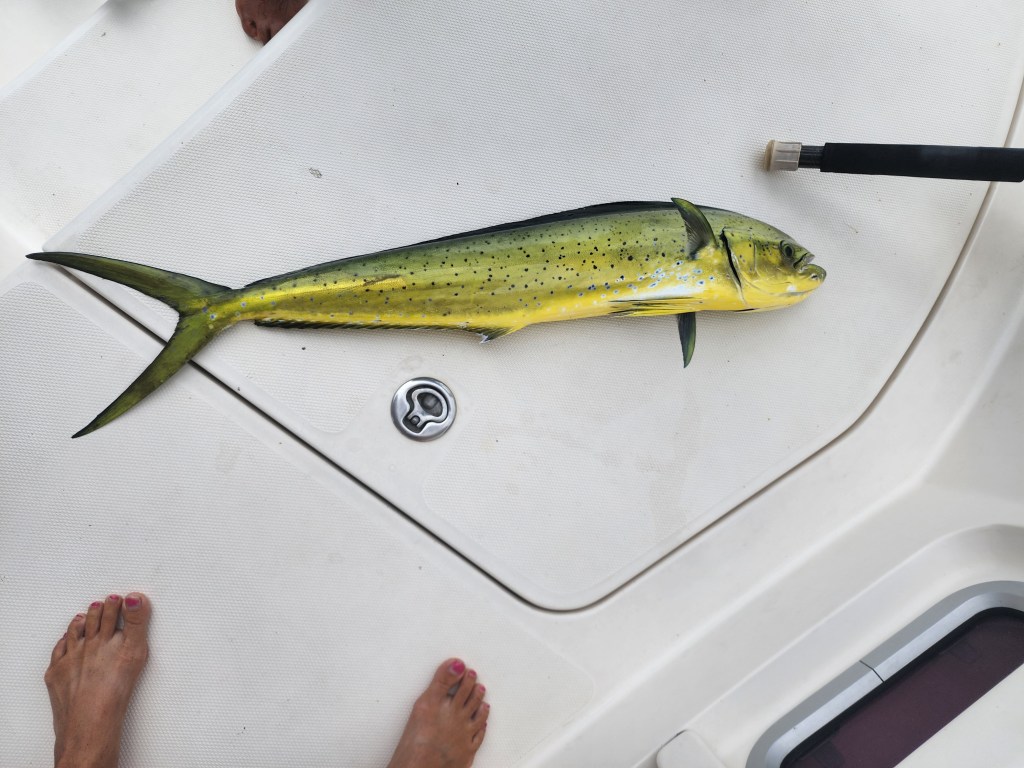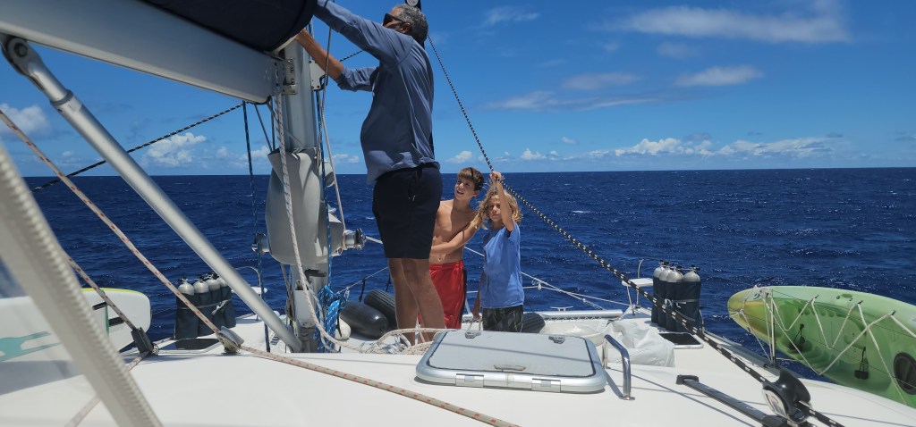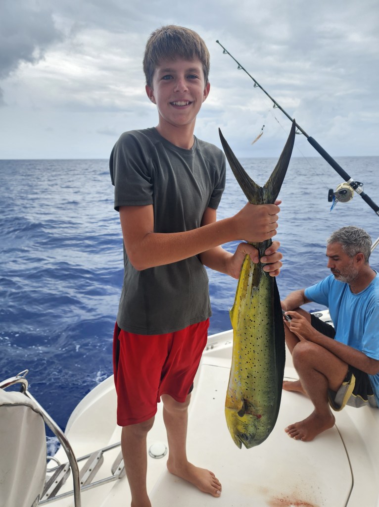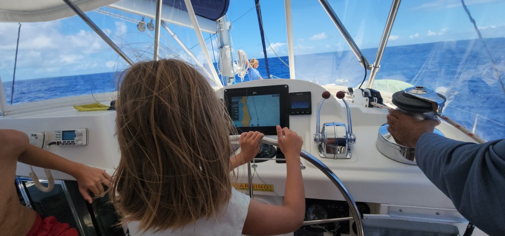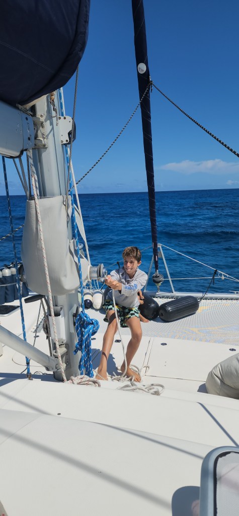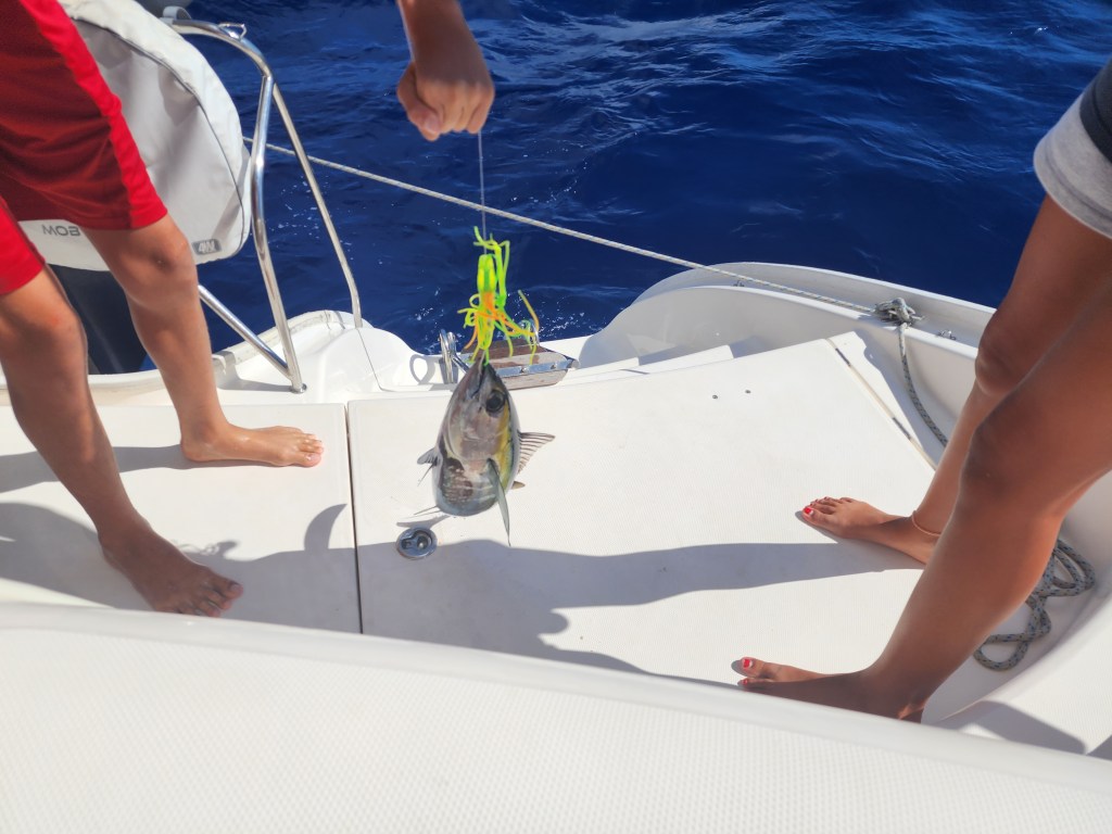 We caught another fish, a tuna. Kira reeled it in. Cade had a mahi mahi on the hook but it came off. We cooked up the tuna for dinner. It was tasty. It’s so fun to be finally catching and cooking fish.