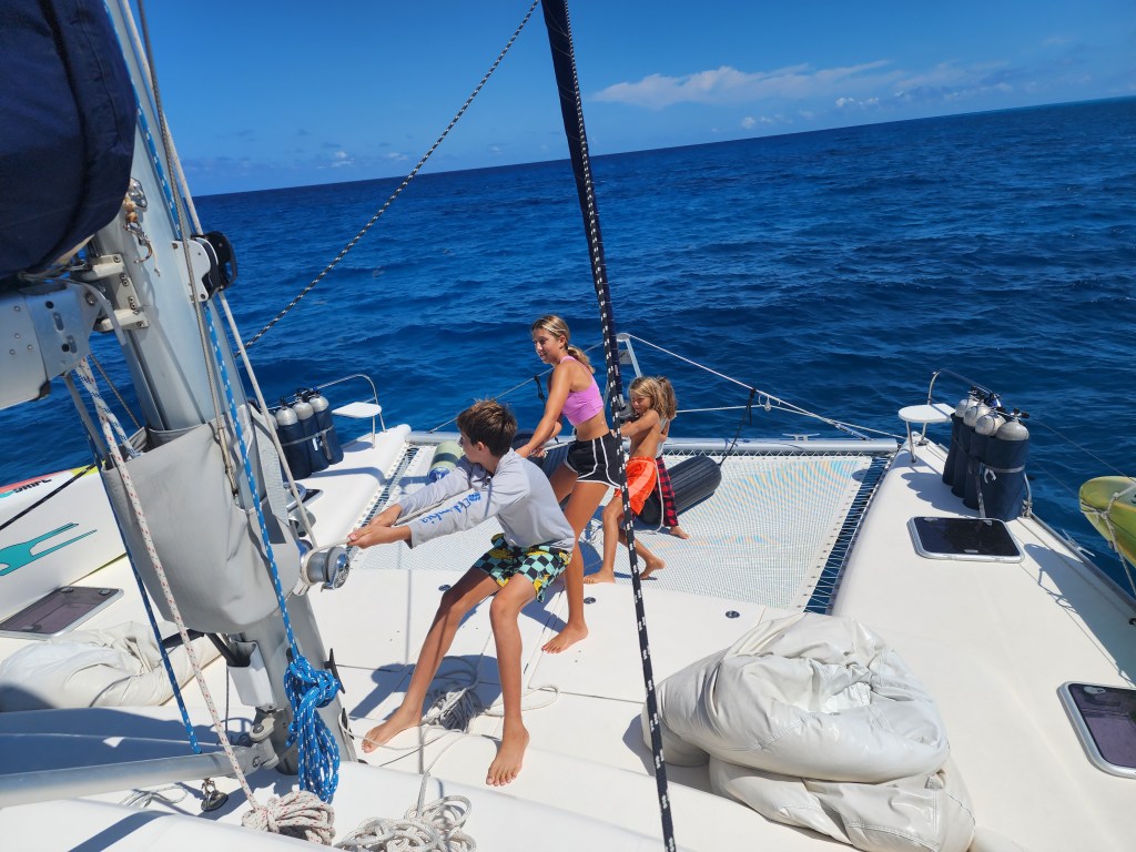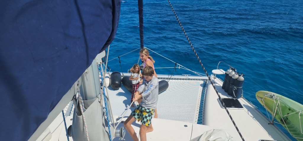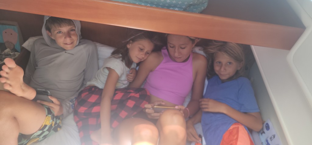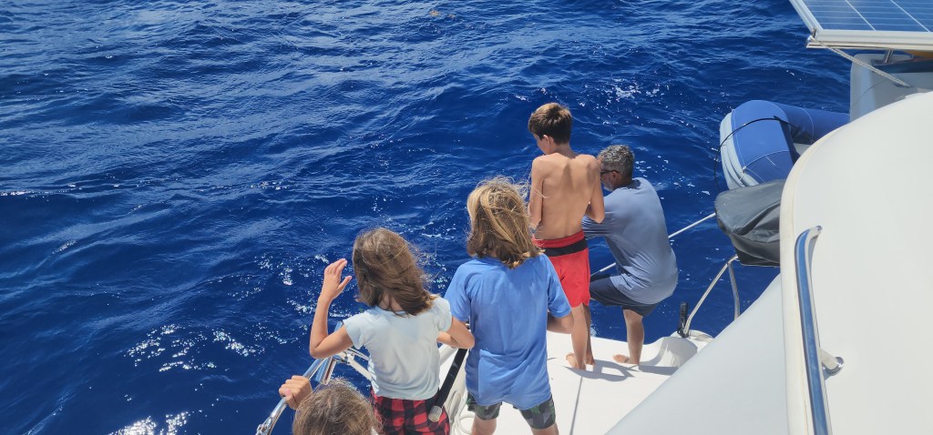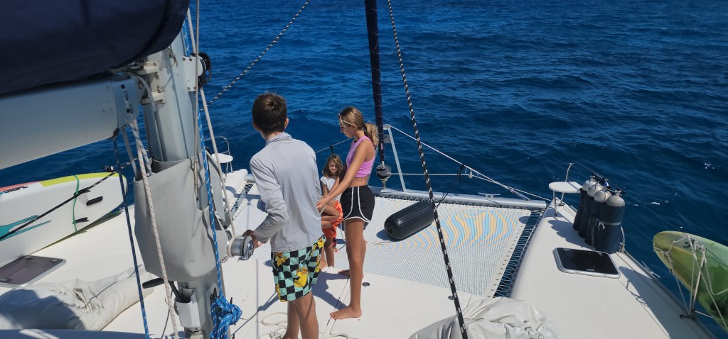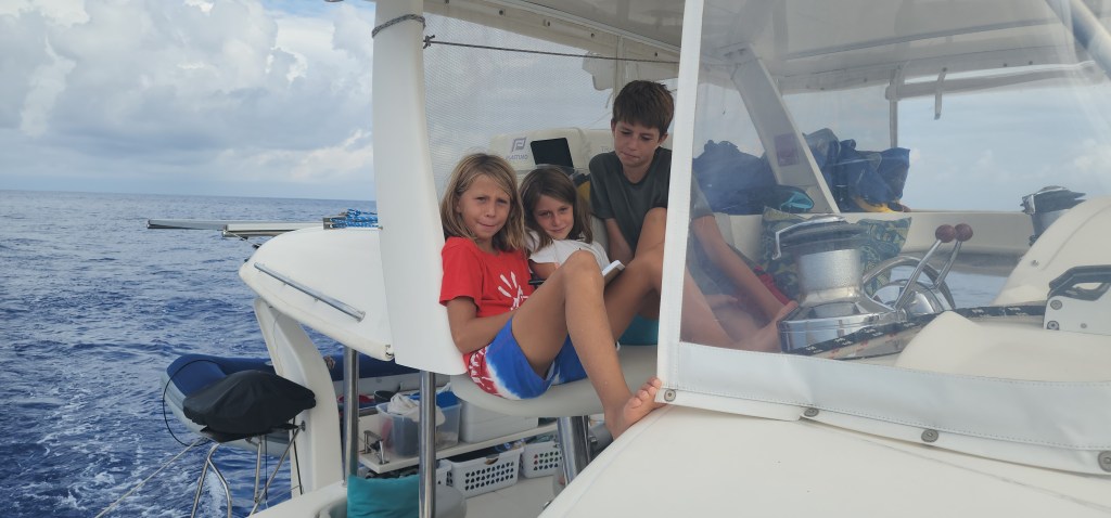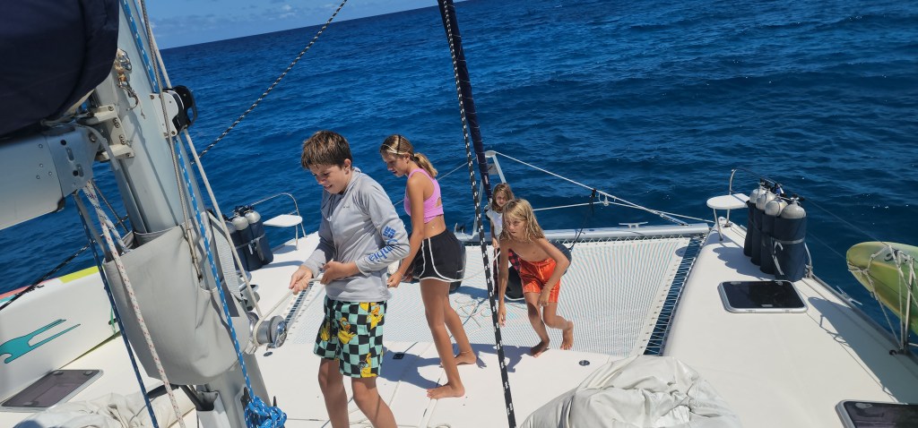 The shift schedule didn’t quite work out how we planned. Cade didn’t wake up for his shift, so Cale did 10-2. I came up at 2. About 4, Cade stumbled up and slept on the bench with me. I didn’t think I’d be able to go back to sleep so I didn’t wake up Kira for her shift. At around 7, I woke up Cole. Him and Cade did a shift together for awhile and Cale came up shortly after. The rest of the day is just a rotation of looking at the water, moving places to sit, filling water, trying to eat, killing time, and catching up on sleep. The kids had a record amount of screens. I had a bad headache so didn’t have the energy to have them do other things. They took a break mid-day for a while and we sat up front. It was really beautiful. Cole caught a mahi-mahi. We were so excited, but then not as much when we had to kill it. We got a Marine Biology lesson done. Thankfully, no storms caught us although we could see some in the distance. As we got close, around 10pm, there were some fishing buoys so I went out front and watched. There were tons of flying fish. I could also sometimes see fish at the bottom. The water was really clear. There was also so many mosquitos. Cale had shut the doors, but not before a lot had gotten inside. We got the anchor set pretty quickly. It was a nice sandy bottom. We are at Great Inagua, Matthew town in the Bahamas!!
