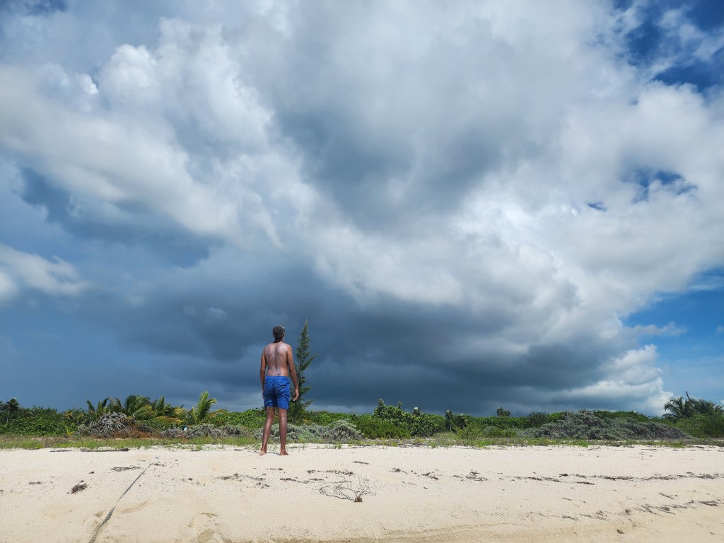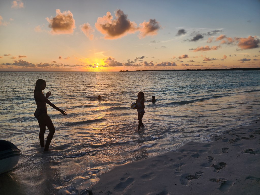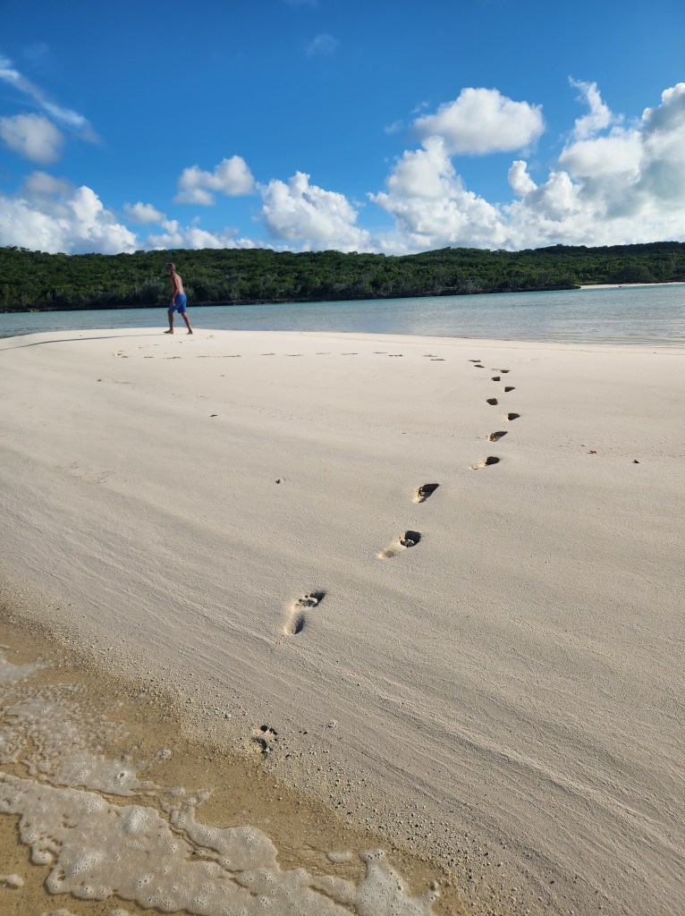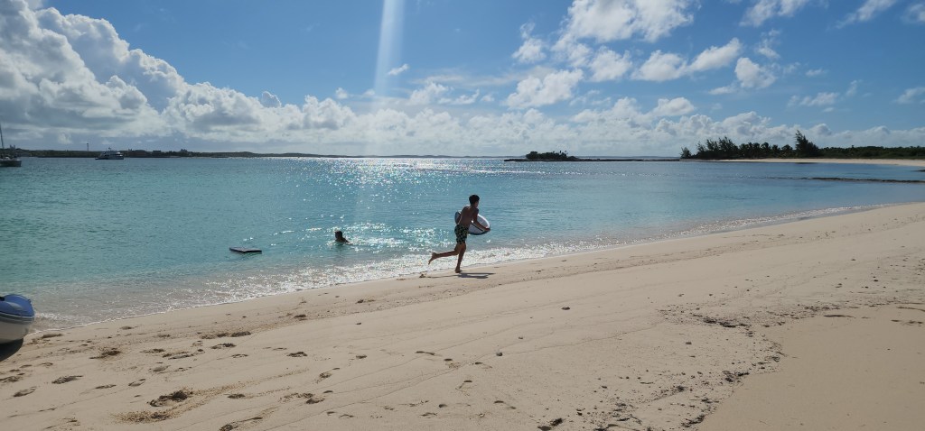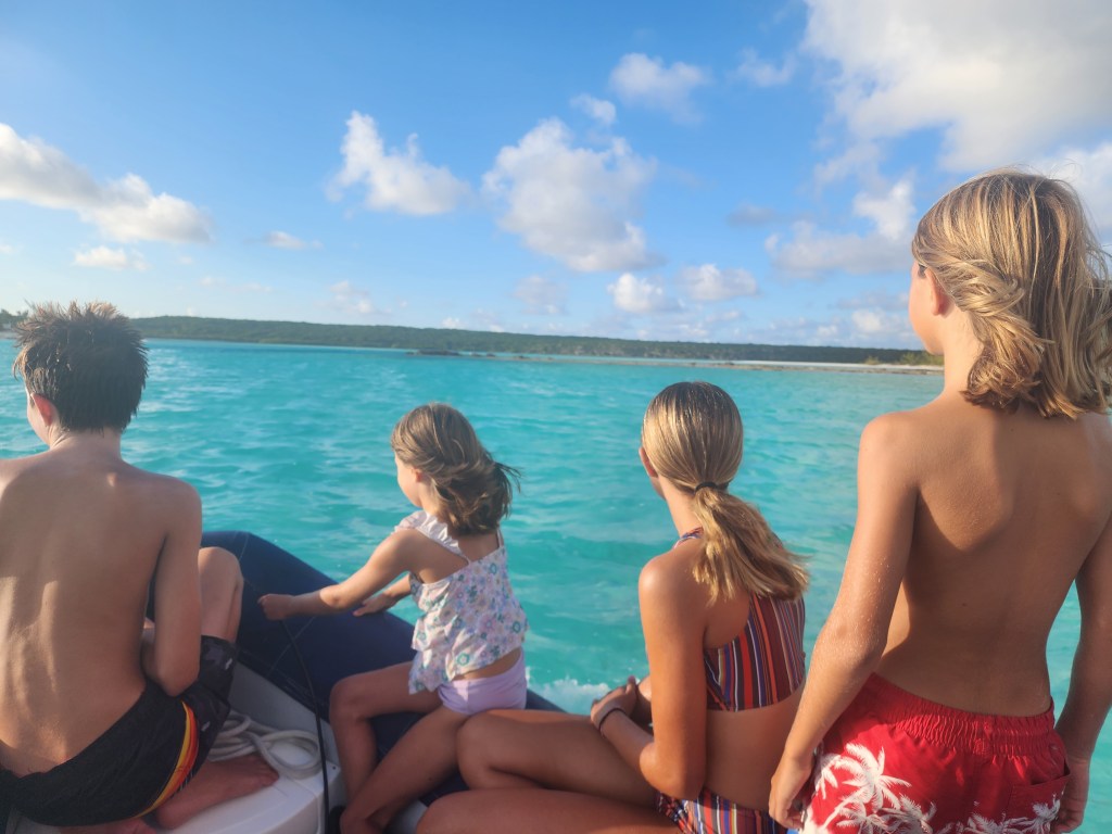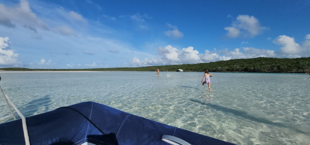 We put all the electronics in the oven and waited. The storm dissipated before it got to us, thankfully. Around 11:30 am, we decided to jump up to Crooked Island for a little more protection for the night. It’s a beautiful spot. The kids jumped off the boat. We went snorkeling. It wasn’t great where we went as far as corral ,reef, and fish. We did see a huge barracuda that wouldn’t leave us alone. It just kept following us. The kids eventually got nervous and we got out. While we were standing on the beach Cole saw a shark. I was skeptical at first, but sure enough there was a big shark along the shore. He would come in close and then go out, then come back in again. The kids (and Cale) grabbed their masks and got in at the shore to try and see it. It was a big one! Cale thought a reef or bull shark. Yikes!! Right where we had just been snorkeling. We went back to the boat, because a storm was building off the shore. It didn’t end up being much. Once it passed, Cale and the kids went fishing at a spot where we could see tons of fish feeding and lots of birds. I still have a terrible headache, so I stayed back. Sadly, the only thing they caught was a barracuda. Cole tried the drone again. We had dinner, did scriptures, watched the chosen and went to bed. If the weather looks good, we will leave tomorrow for Clarence Bay.