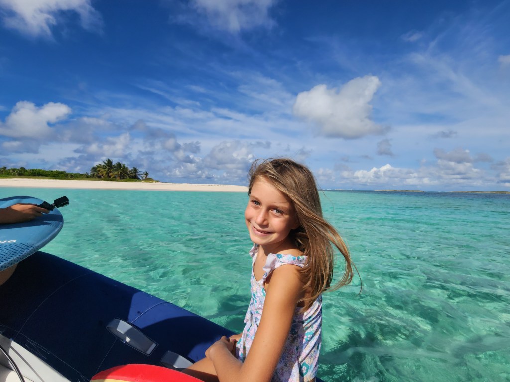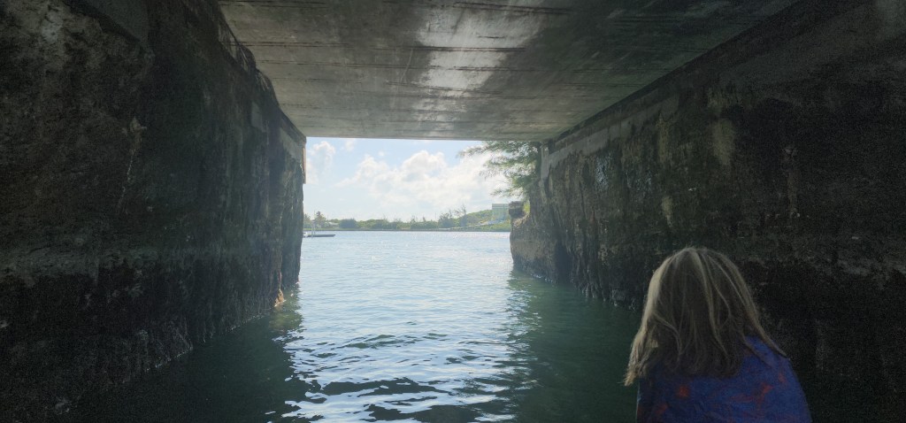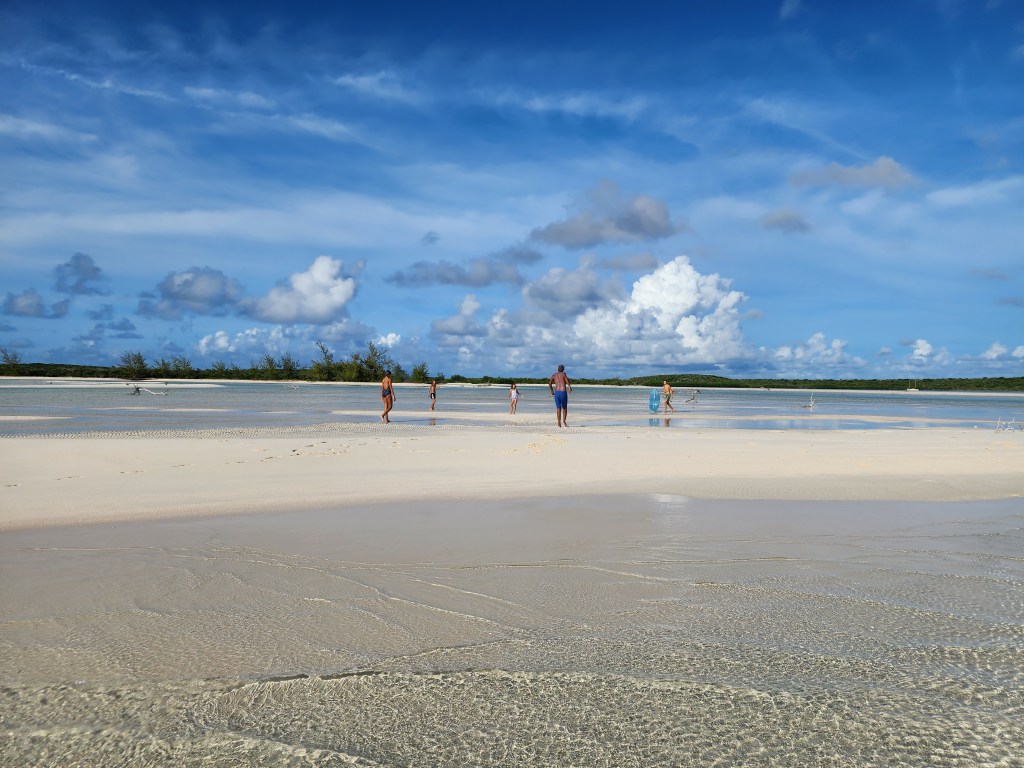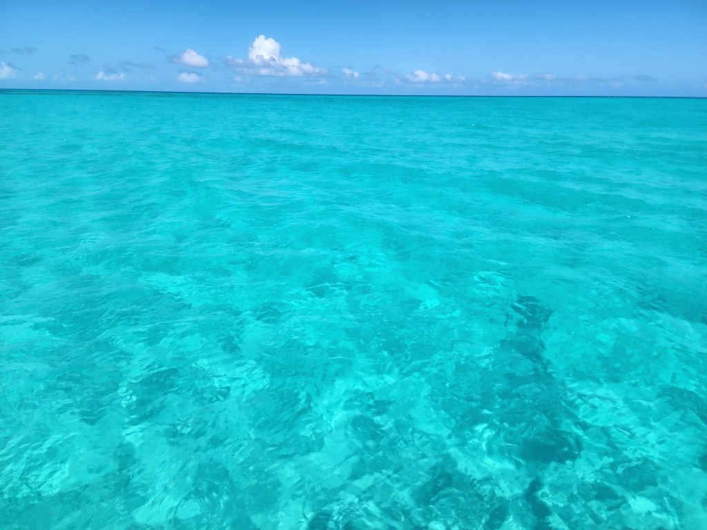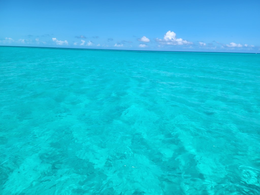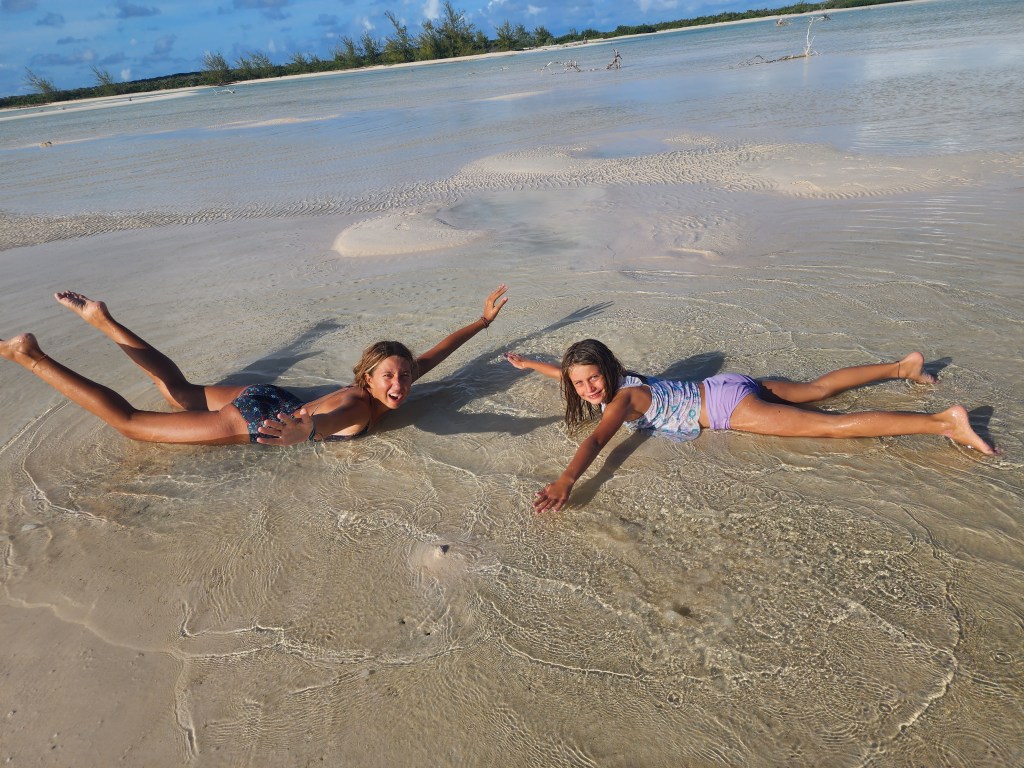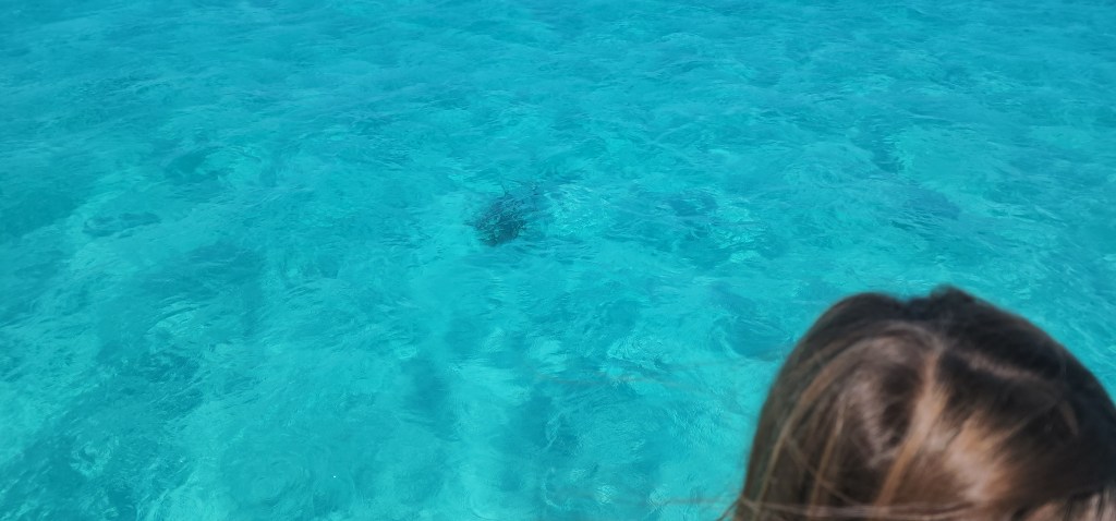 There wasn’t too much to see, but it was super clear water. We then dinghied over to a sand bar by the Blue Hole. The kids had a blast playing on the sand bar. It was exposed because the tide was so low. Even as we sat there it started to get covered with water. The boys skimmed and we played volleyball. We dinghied a bit over to the mangroves, but it was still super shallow. We did see a very cute little green turtle. We also saw a couple huge rays in the water. We stopped and swam at the Blue Hole. It went from 3 feet to 650 feet super quickly. It was a little creepy.
