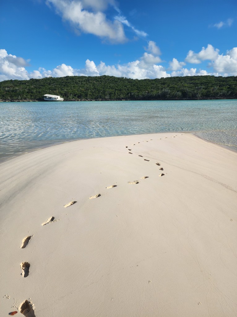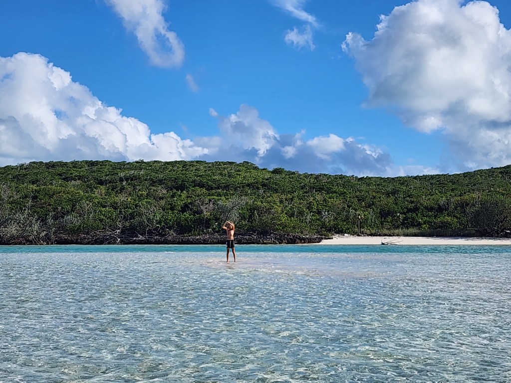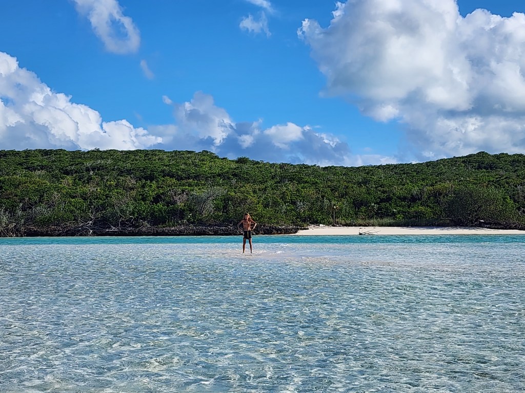 The entrance into this anchorage (Calabash) is pretty narrow. We sat up front looking for shallows as we came in. We got the anchor set and immediately saw a couple sharks swimming around the boat. They would come out from the grassy area about 20 feet from where we were anchored over sand. We dinghied around the mangrove but it was pretty shallow so we ended up at the beach. We met a guy who lives alone on his boat named Marcos, from Honduras. He has been in the Bahamas about 2 months. His English was a bit hard to follow, but he showed us some cool places to check out.